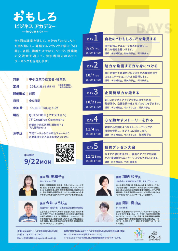 京都信用金庫様が運営する共創施設QUESTIONにて、『おもしろビジネスアカデミー inQUESTION』5日間のプログラム開催。その中で「自社の強みやユニークな点を深堀する」講座、「心を動かすストーリーを作る」講座を担当。PRとマーケティングの知見を合わせて提供いたしました。